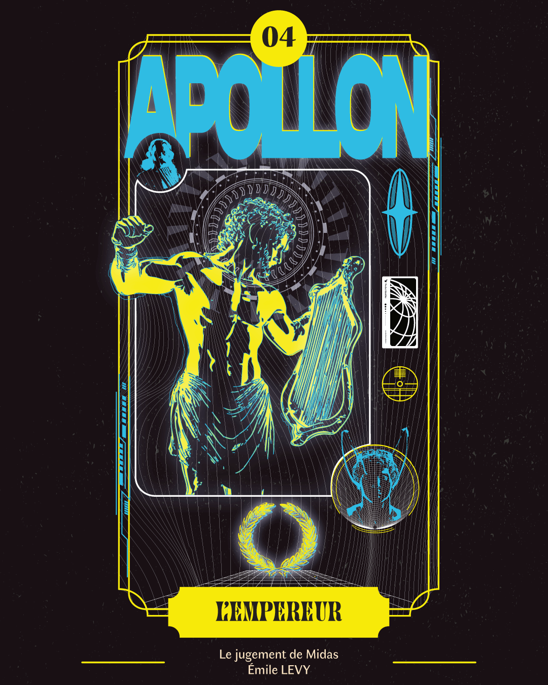 Dans cette reprise également, j'ai gardé les points forts de l'œuvre originale et son histoire. Dans l'histoire du tableau, Pan et Apollon sont mis en concurrence dans une épreuve musicale. Midas devra juger qui est le meilleur des deux. Apollon, Dieu de l'art poétique et de la musique remporta évidemment le concours, mais le Roi Midas en fit qu'à sa tête et donna la victoire à Pan. Pour se venger Apollon remplaça les oreilles de Midas par celles d'un âne. J'ai alors remis au centre Apollon avec son instrument et dans les angles opposés, sont adversaire ainsi que Midas avec ses oreilles d'âne.
