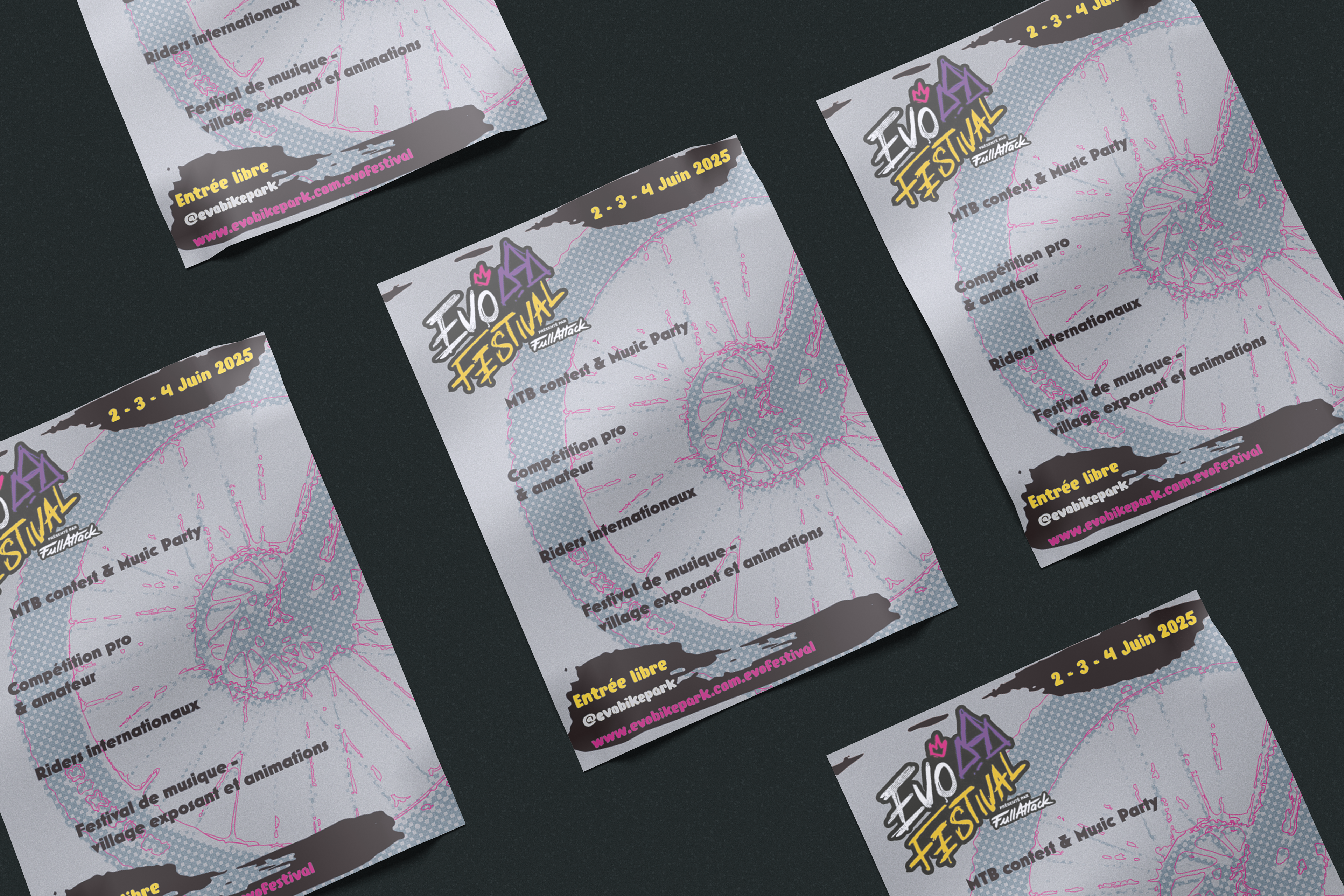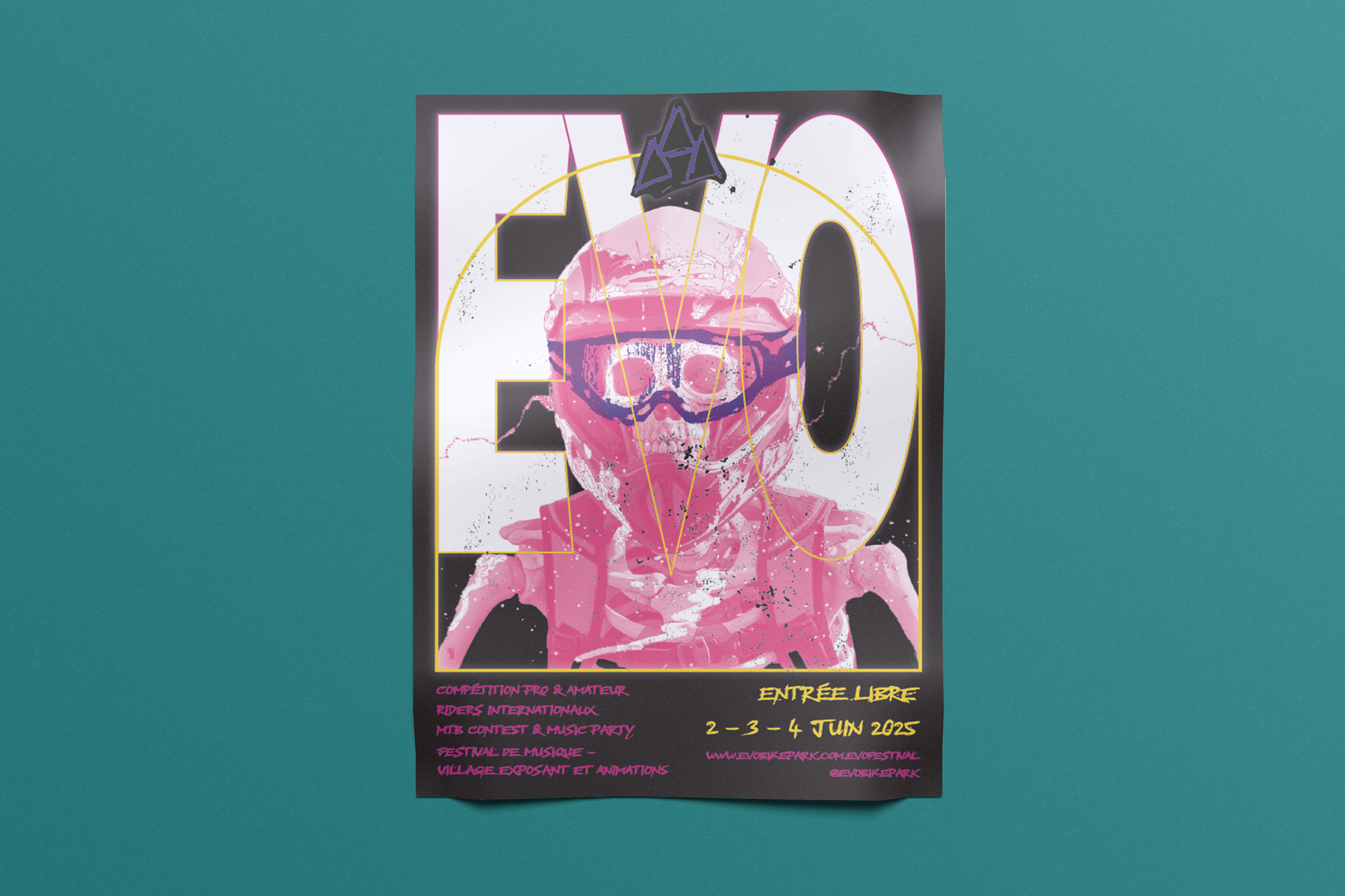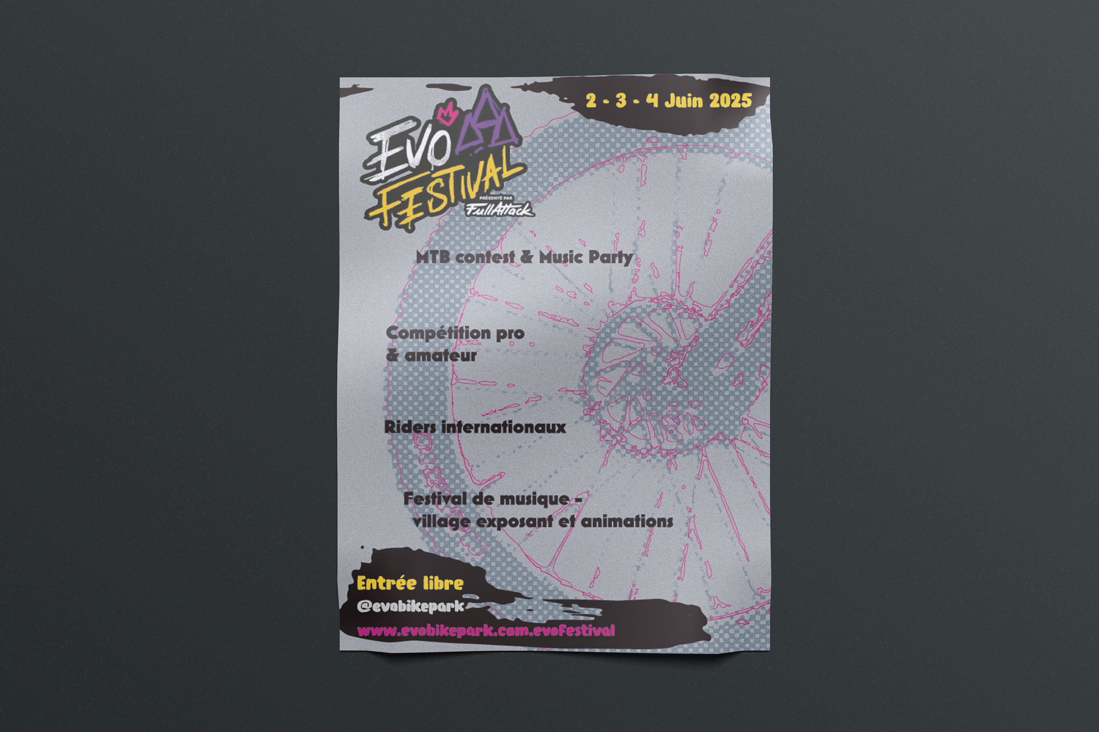 J'ai repris le logo et les couleurs de l'événement et j'ai composé une affiche commerciale autour de la roue d'un VTT. J'ai ajouté différentes textures pour rappeler l'univers de l'Evo Festival.